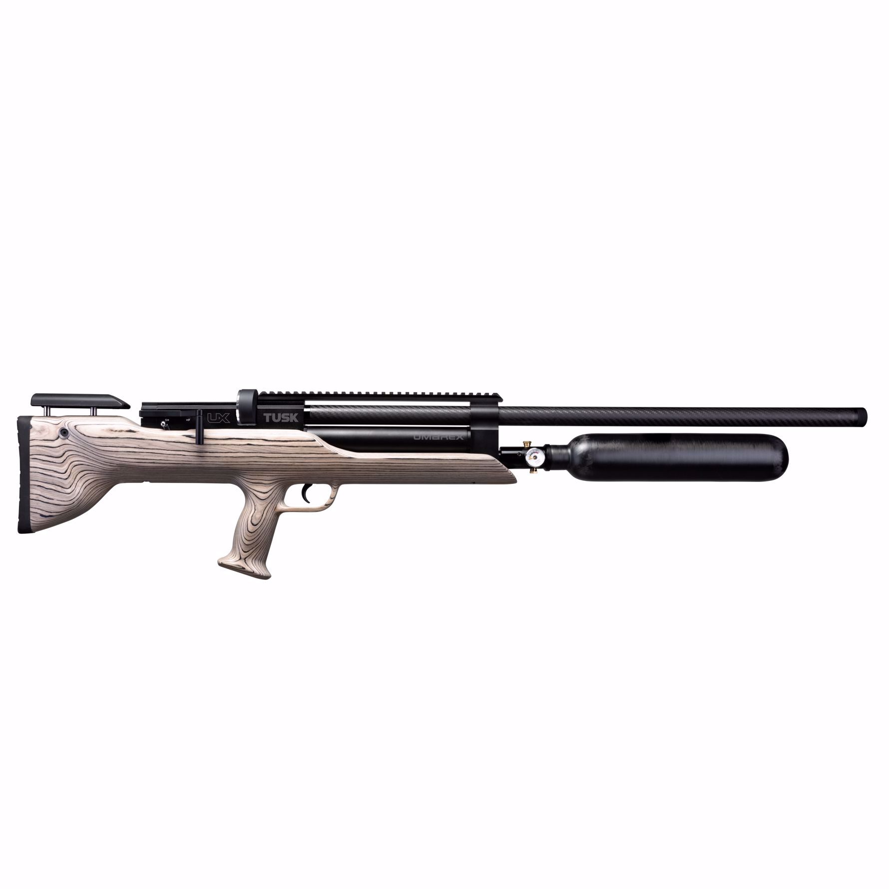 When you get close to a hog, you better watch our for the Tusk! If you are ready to experience a leap in precision and power between true big bore PCPs and popular small bore PCPs, we introduce you to the Umarex Tusk .357 Caliber Pre-Charged Pneumatic Air Rifle, a precision PCP airgun designed for serious hunters and recreational shooters. This .357 caliber air rifle delivers unmatched performance, firing .357 caliber (9mm ) pellets or airgun slugs up to 1,085 FPS with 82-grain pellets and generating 228 FPE with 100-grain slugs, making it ideal for medium size game hunting and long-range accuracy. Engineered with a robust 500cc carbon fiber tank rated for a maximum fill of 4,350 PSI and a regulated 3,250 PSI output, the Umarex Tusk ensures consistent shots without power loss. Its smooth side lever action, paired with a 28-inch barrel featuring a 1:43 twist rate and carbon fiber shroud, enhances stability and reduces noise. The laminate stock offers a comfortable 13.75-inch length of pull and adjustable comb for customized fit, while two 8-round magazines provide quick reloading. Equipped with a Foster quick connect fill fitting, degas screw, M18x1 muzzle thread, and M18x1.5 tank thread, this pre-charged pneumatic airgun is user-friendly and versatile. Whether you're targeting predators or shooting in airgun competition, the Umarex Tusk .357 stands out among powerful PCP air rifles for its reliability and innovation. Elevate your shooting game today!